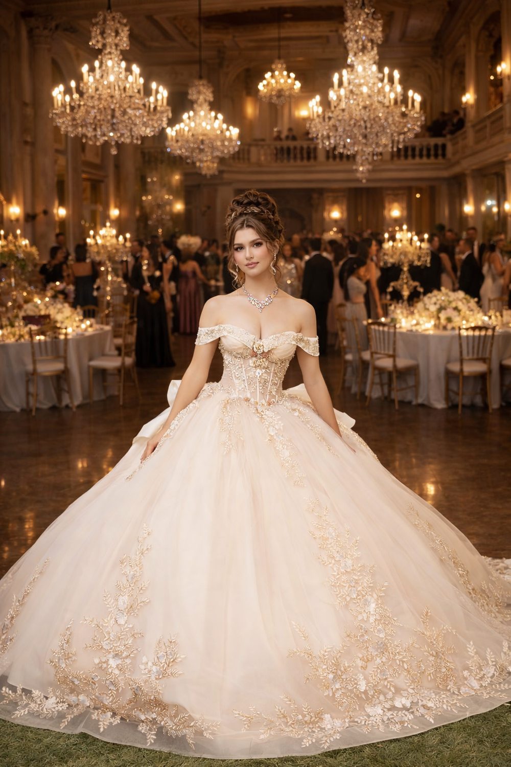 Make a grand entrance in this enchanting off-shoulder ball gown, designed for unforgettable Quince moments. The sweetheart neckline and sheer corset bodice are richly adorned with iridescent gems, sparkling rhinestones, and 3D acrylic flowers. A shimmering silk overlay flows into a dramatic train, while layers of glitter tulle add movement and magic. Finished with a lace-up back for the perfect fit, this dress is a true showstopper for your Sweet 15.
