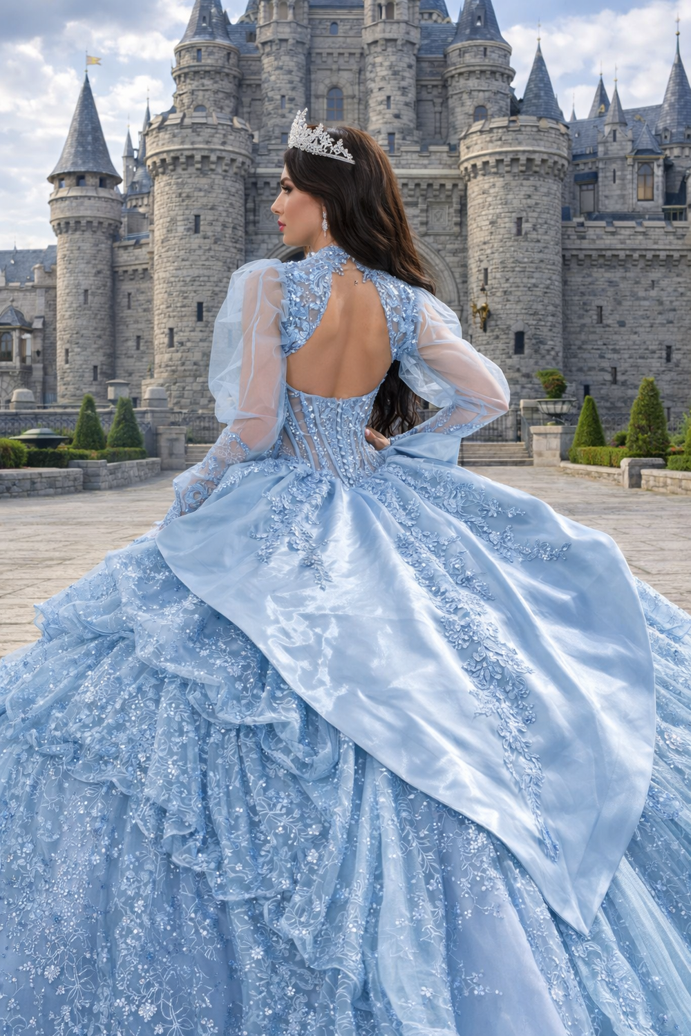 Make a grand entrance in this exquisite quinceañera ball gown designed to command attention from every angle. The strapless corset bodice features a flattering V-neckline and a sculpted Basque waist that defines the silhouette beautifully. Sparkling beads, sequins, jewels, and intricate embroidery create rich dimension across the bodice and skirt. A dramatic satin ruffle layer extends into a longer back tail, while soft tulle bubble hem layers beneath add volume and playful movement, finished with glittering floral motifs throughout.