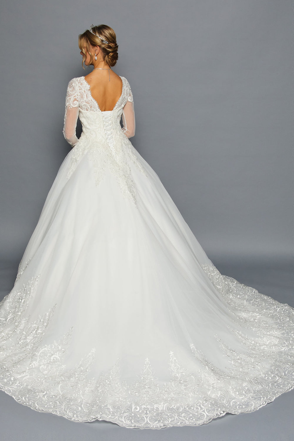 This ball gown wedding gown features a v-neck with long sleeves, crafted to flatter and elongate the silhouette. Beaded lace and sequins appliqué add luminous depth and refined sparkle throughout. The floor with chapel train ensures graceful movement from ceremony to reception. Timeless and elegant, it’s designed for unforgettable bridal moments.