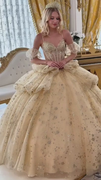This embellished ball gown features a sheer corset bodice with beads, jewels, sequins, glitter, and metallic thread. Spaghetti straps lead into a V-neckline, while two layers of bubble-hem ruffles create sculptural volume at the skirt. The voluminous skirt is adorned with glittering floral accents. Detached puff sleeves match the skirt’s embellishments, adding a whimsical touch. A detachable back bow mirrors the glitter flower design, and the longer bubble-hem layers extend behind for a dramatic silhouette.