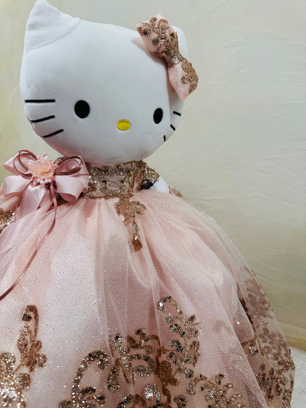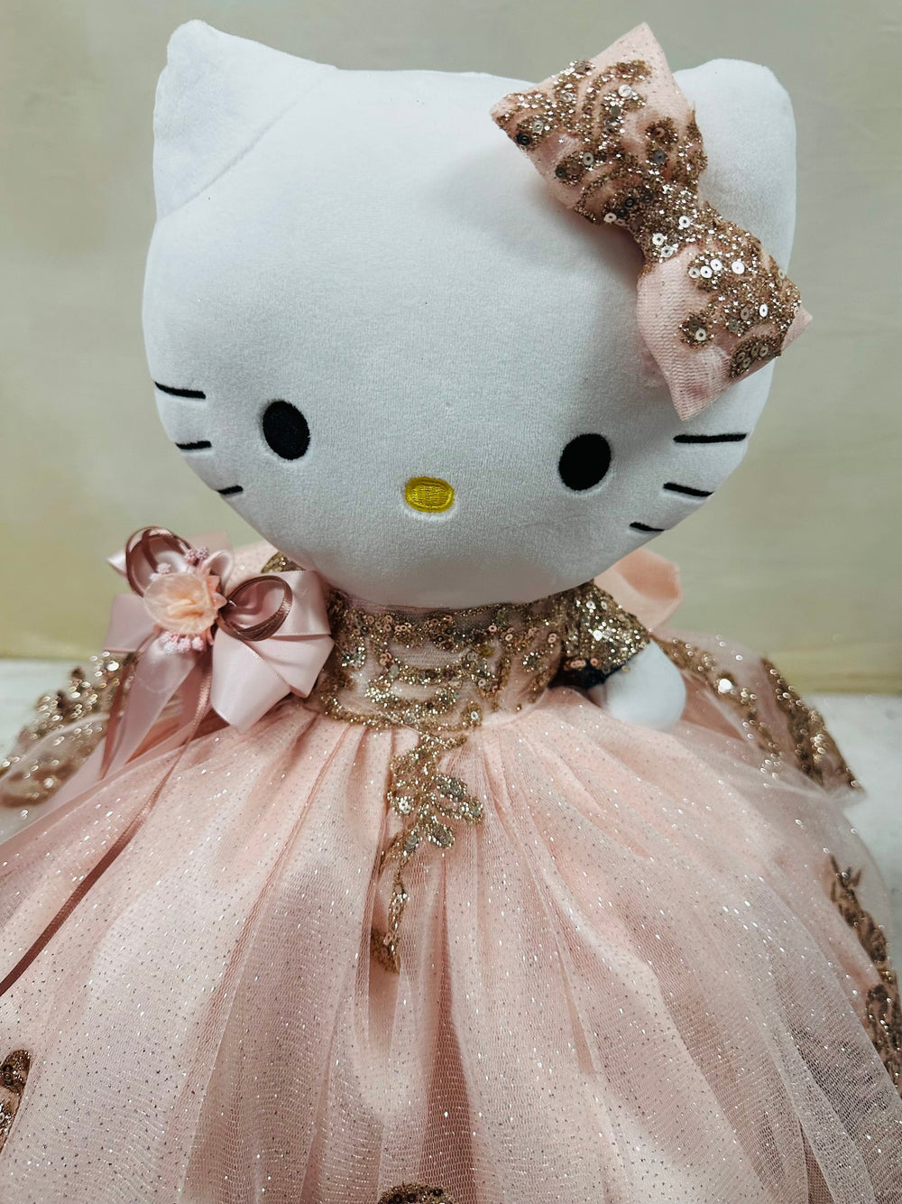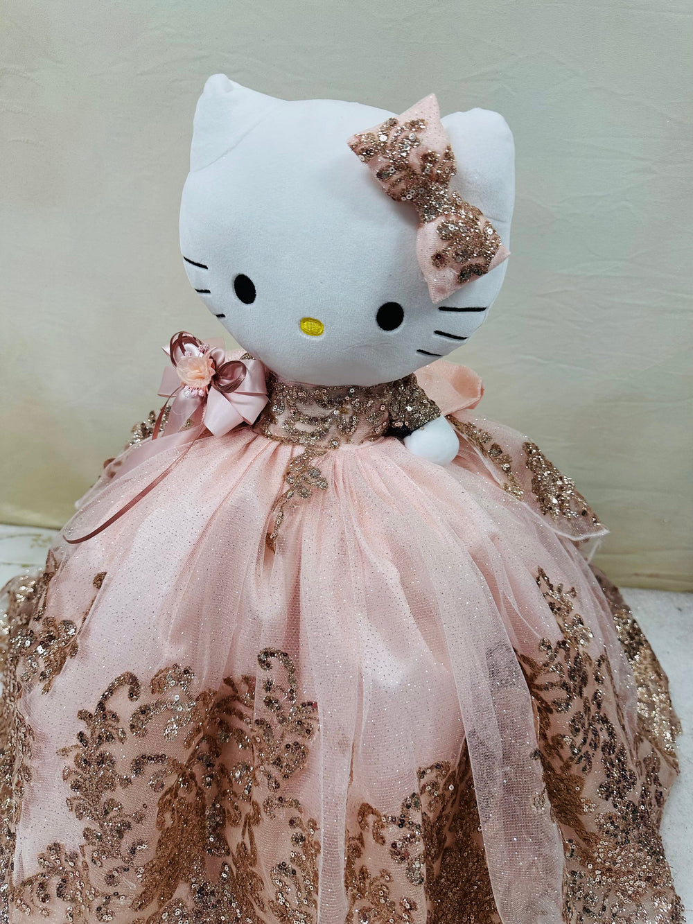 This Hello Kitty plush doll is specially designed for quinceañera parties. With its charming look and soft fabric, it is perfect as a centerpiece, gift, or keepsake for this special celebration.