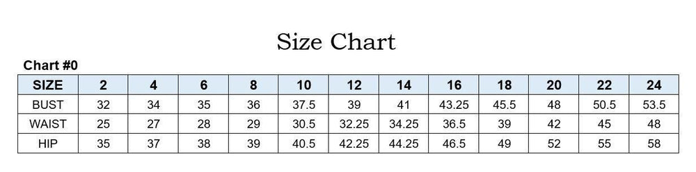 | Size | Bust (in) | Waist (in) | Hips (in) |