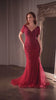 Gracefully refined, this fitted gown showcases a flattering V-neckline, elegant short sleeves, and a fully beaded motif over delicate tulle. The fit-and-flare silhouette provides graceful movement, combining modest sophistication with timeless charm. Ideal for mothers of the bride, black-tie weddings, or formal events, this gown ensures an elegant statement for any special occasion.