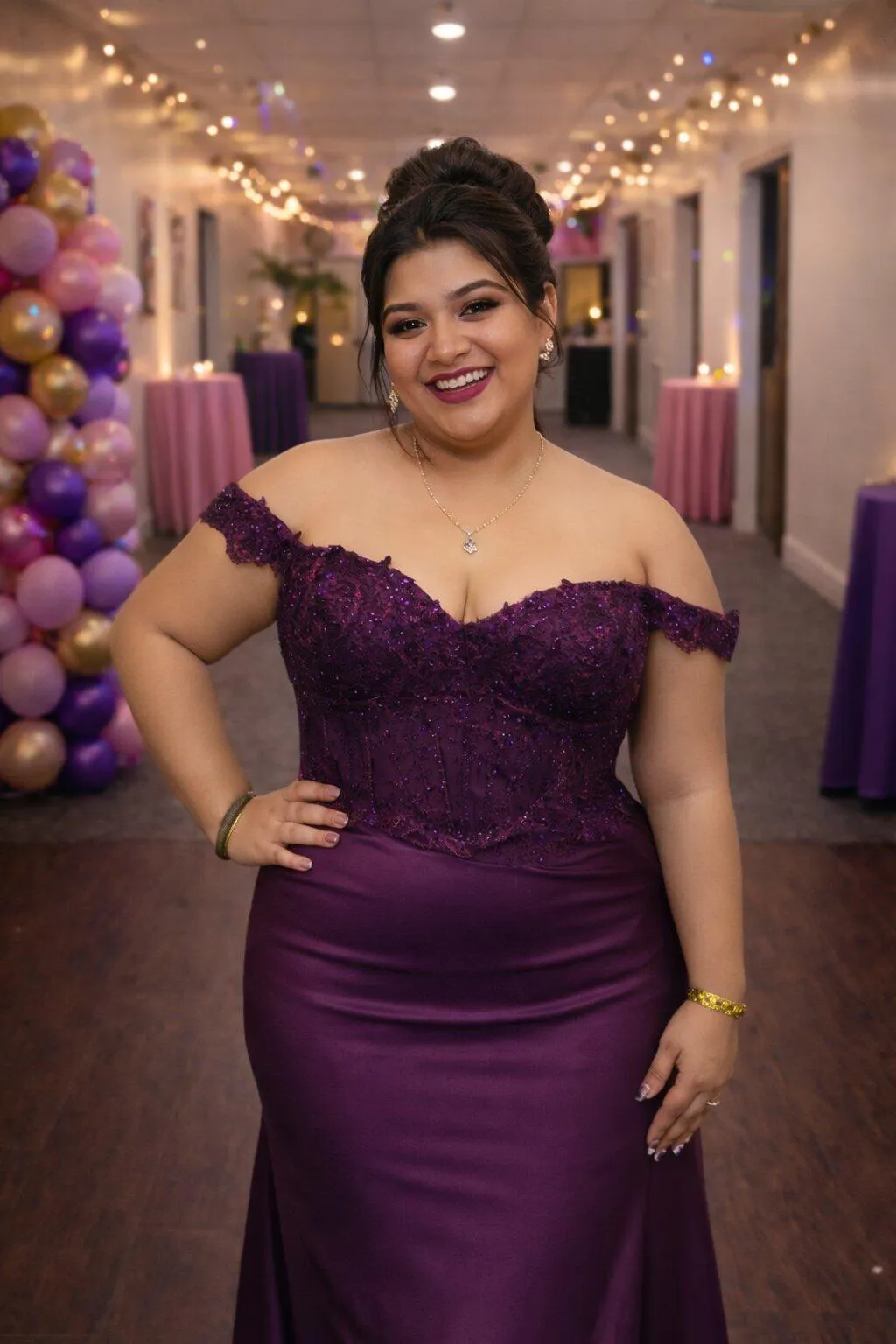 A lace-embellished bodice shapes the upper body beautifully, while the off-the-shoulder design adds romantic allure.