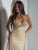 The sweetheart neckline pairs with a sheer embellished bodice that contours the waist and upper body with elegant structure.