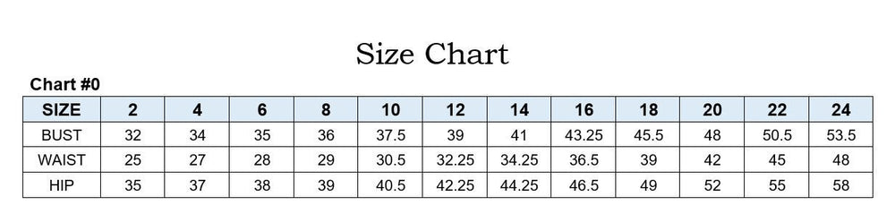 | Size | Bust | Waist | Hips |