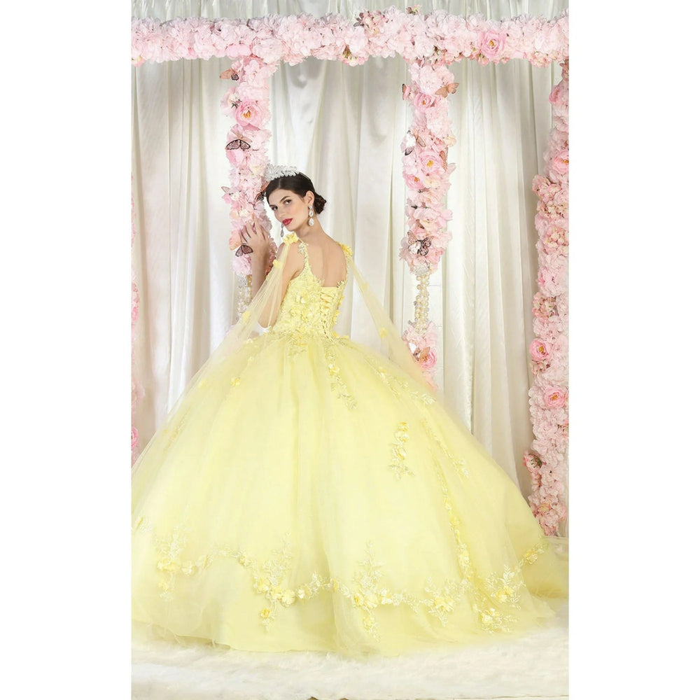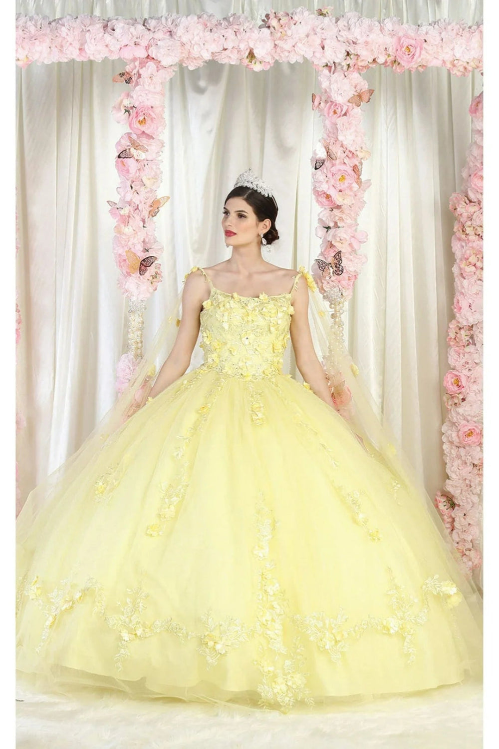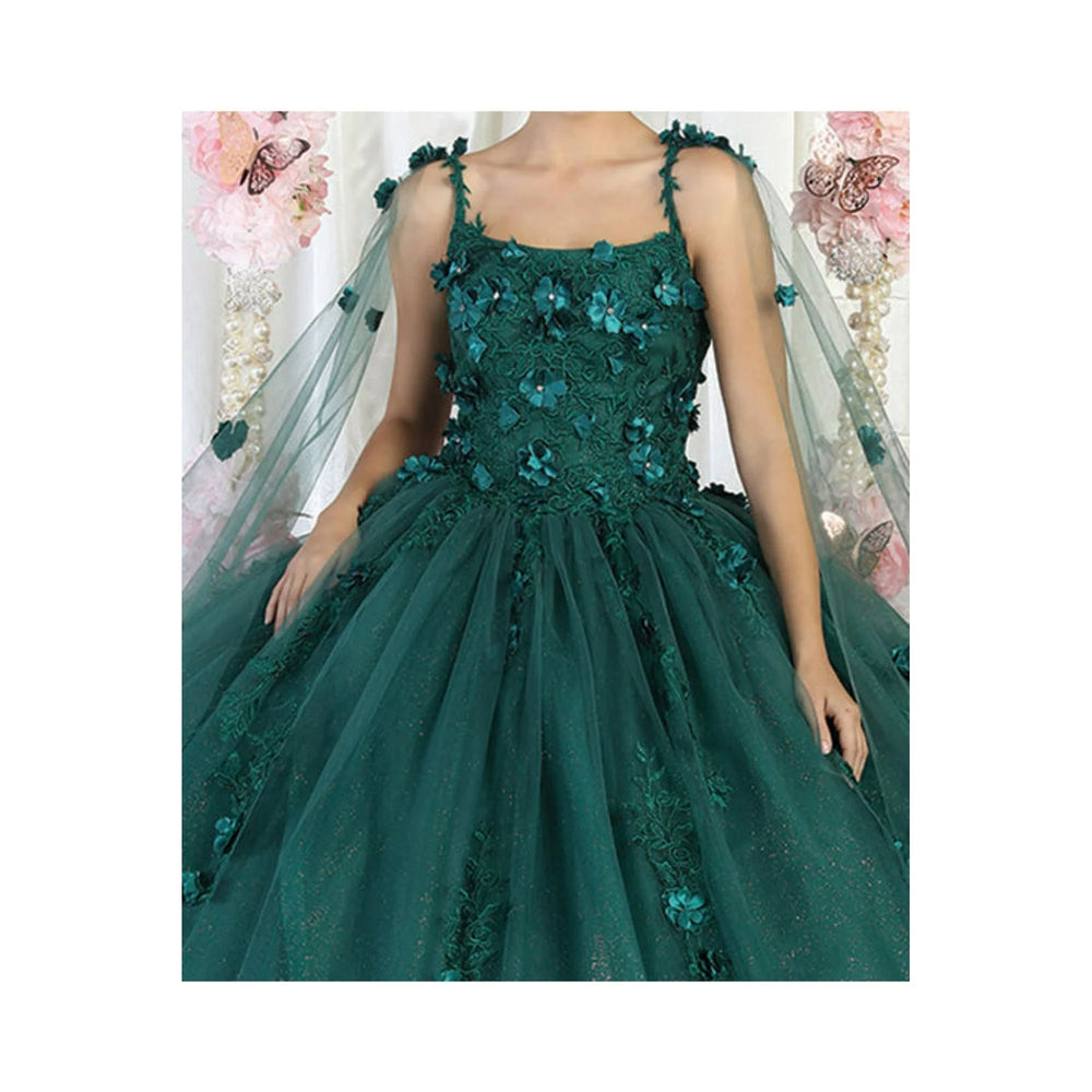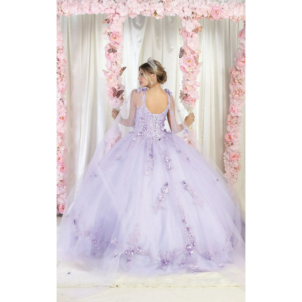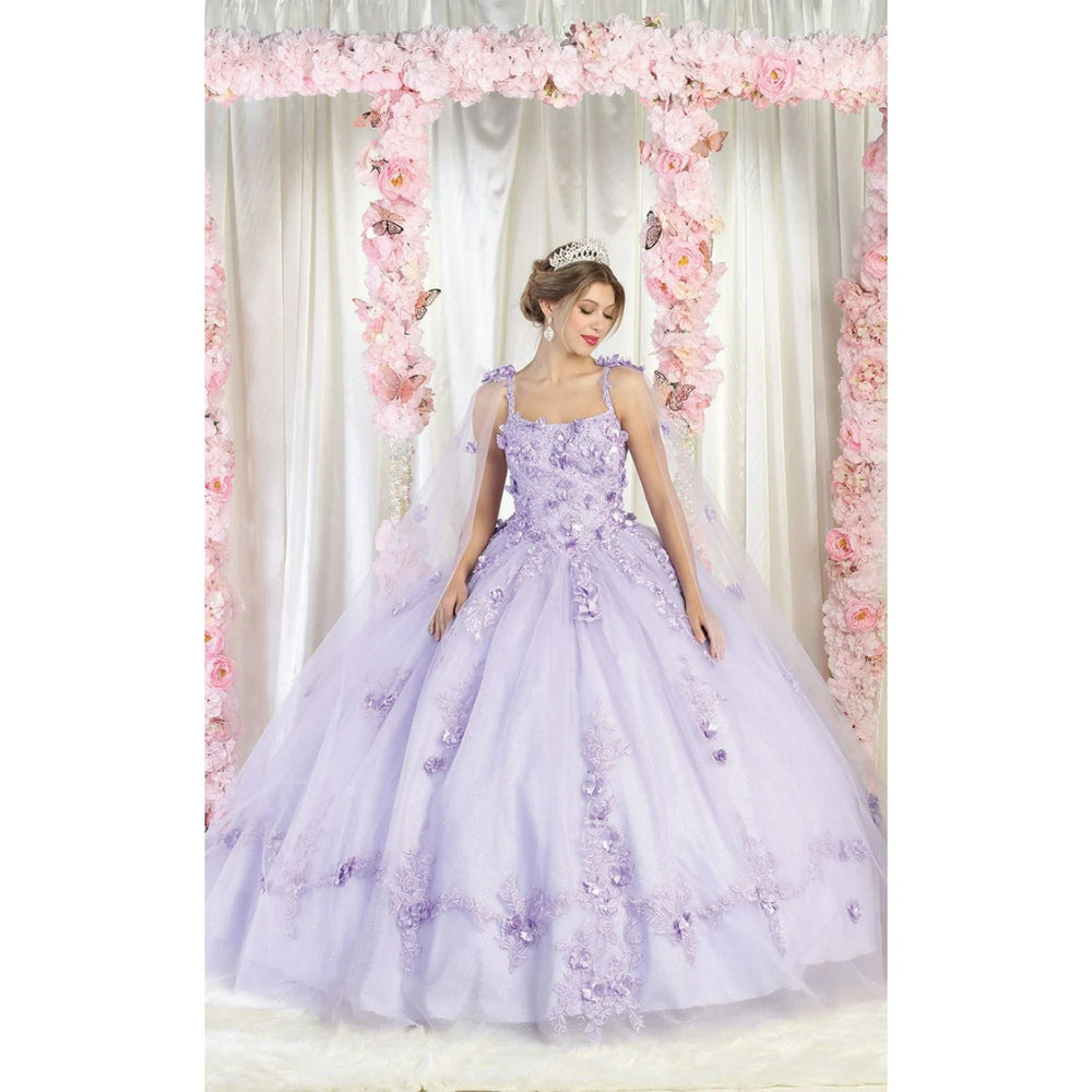 This sophisticated quinceanera gown showcases an off-shoulder neckline, highlighted by ornate lace appliqués and shimmering beadwork. The structured bodice transitions into a full, layered tulle skirt with scalloped edges and a subtle glitter finish for a touch of sparkle. Detachable sheer sleeves offer versatile styling, while the corset back ensures a tailored, comfortable fit. This dress is ideal for those seeking a regal and romantic silhouette.