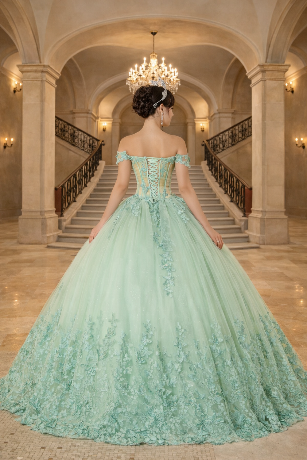 This stunning quinceanera gown features an elegant off-shoulder silhouette with a sweetheart neckline that frames the face beautifully. The structured corset bodice provides support and definition, while sheer illusion panels add sophisticated dimension. Intricate 3D floral lace appliques and delicate butterfly embroidery create visual interest throughout, complemented by a voluminous glitter tulle skirt that captures light with every movement. A true showstopper for your special celebration.